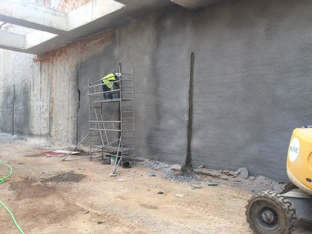 Una vez controlada la filtración, el sellado superficial se realizó mediante la aplicación de un mortero estructural R4 armado con fibra. Este tipo de mortero aporta alta resistencia mecánica, buena adherencia al soporte y capacidad de trabajar solidariamente con el muro, reforzando la zona intervenida y protegiéndola frente a nuevas agresiones.